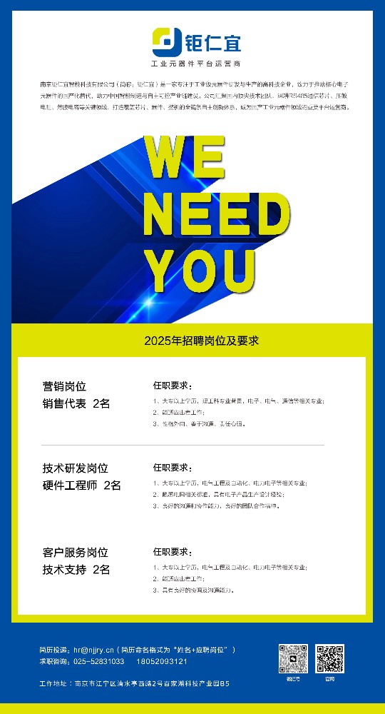 招聘:銷售代表2名,硬件工程師2名,技術支持2名簡歷投遞:hr@njjry_cn.stuhrling.cn求職咨詢:025-52831033 18052093121 2025-07-29